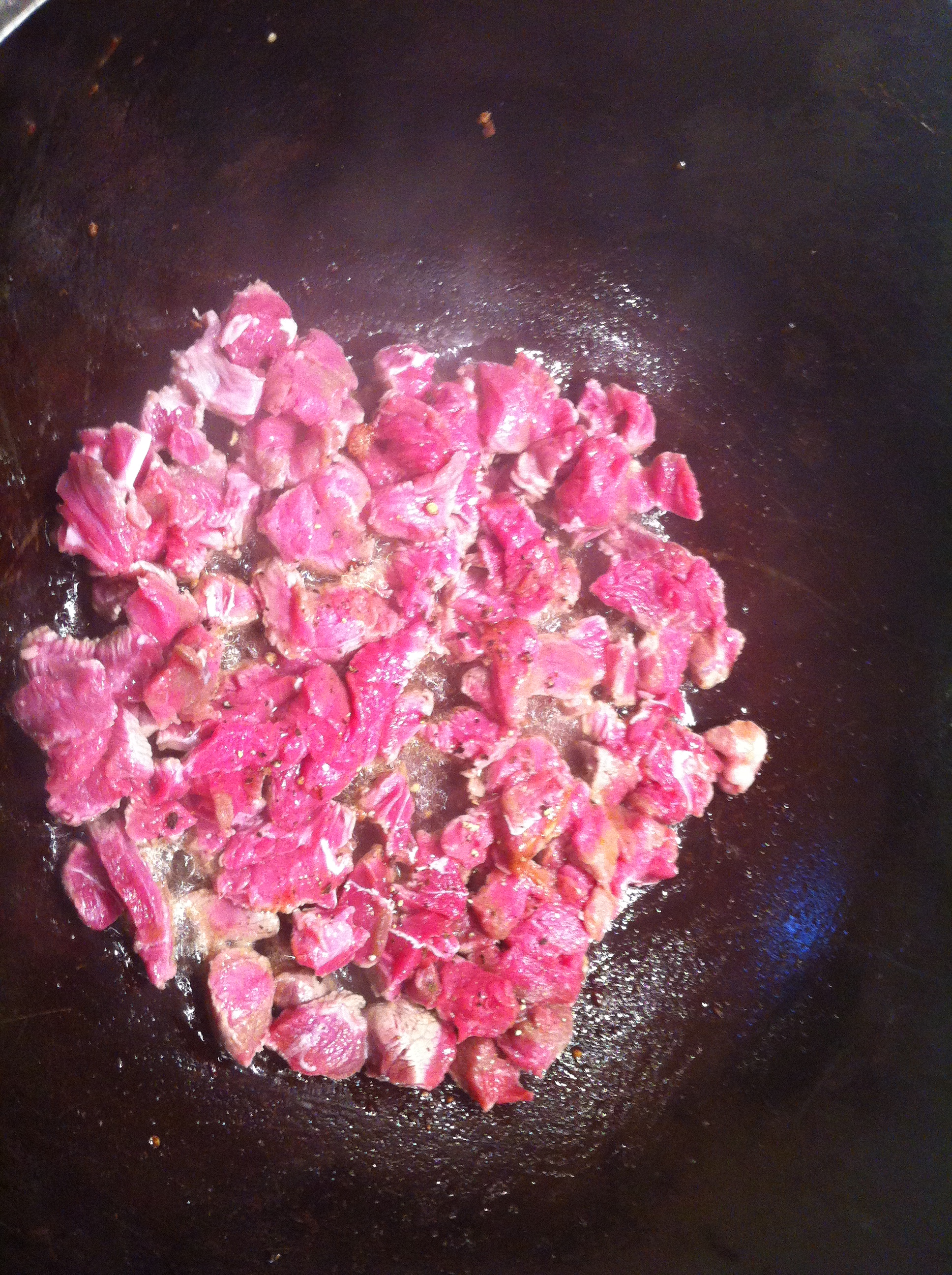 Den afpudsede oksebov skæres i ret små tern på ca 1×1 cm. De svitses i en stegegryde (fordi den kan holder godt på varmen) i små portioner på ca 400 g. Det er vigtigt, at portionerne er små, og at man IKKE rører i kødet de første minutter. Det er for at få en brun stegeflade, som giver kødet smag. Hvis der røres, bliver gryden afkølet, hvilket gør at kødet koger i stedet