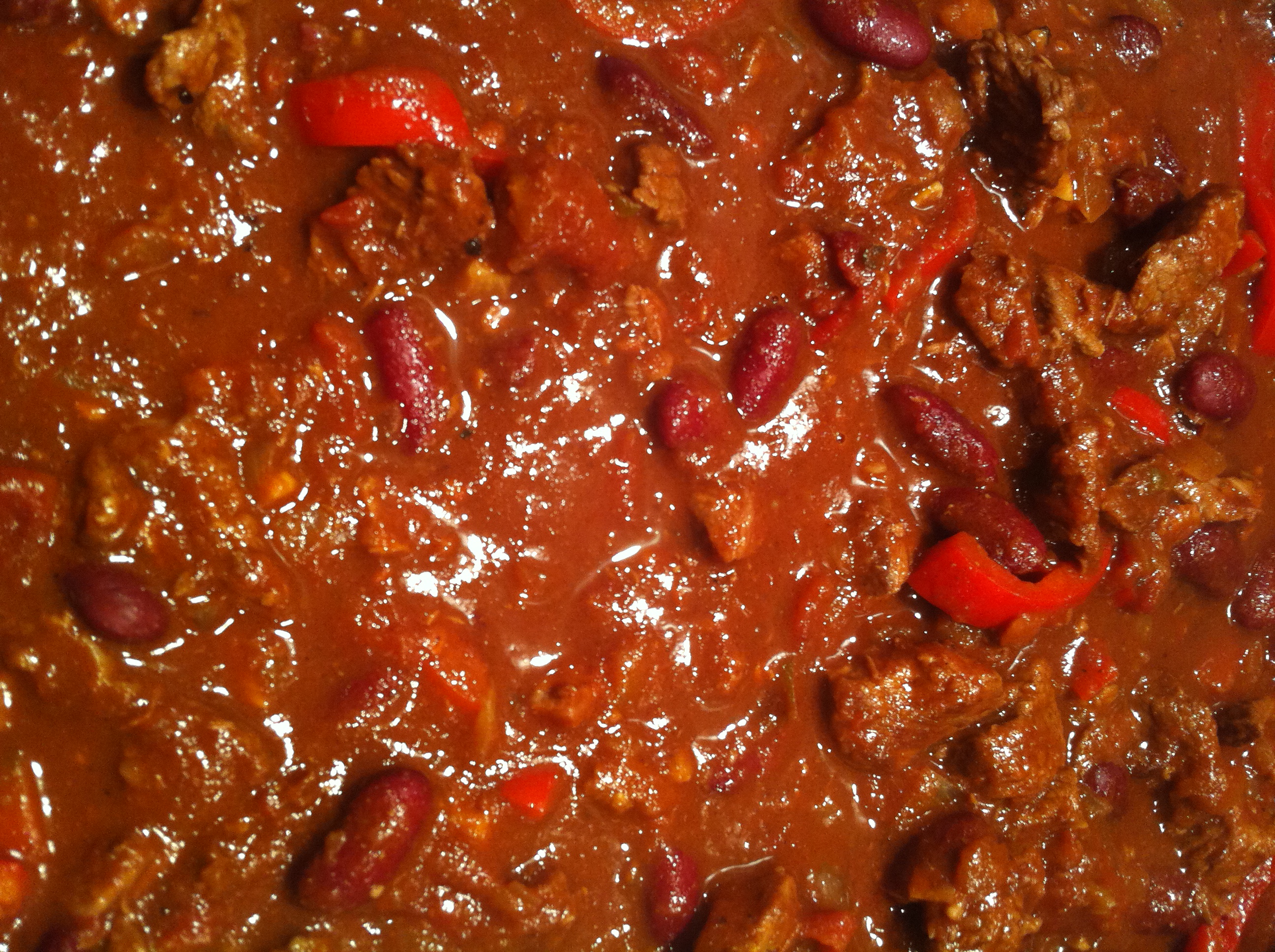 for at stege. Efterhånden som kødes steges, lægges det fra i en skål. Herefter steges løs, hvidløg og chili. De skal stå og småstege i min 15 min indtil de er bløde, klare og lysebrune. Kødes tilsættes igen sammen med resten af ingredienserne på nær chokolade, rød peber og bønner. Chilien småkoger i mindst 3 timer. De sidste ingredienser tilsættes og det simrer atter i ca ½ time.