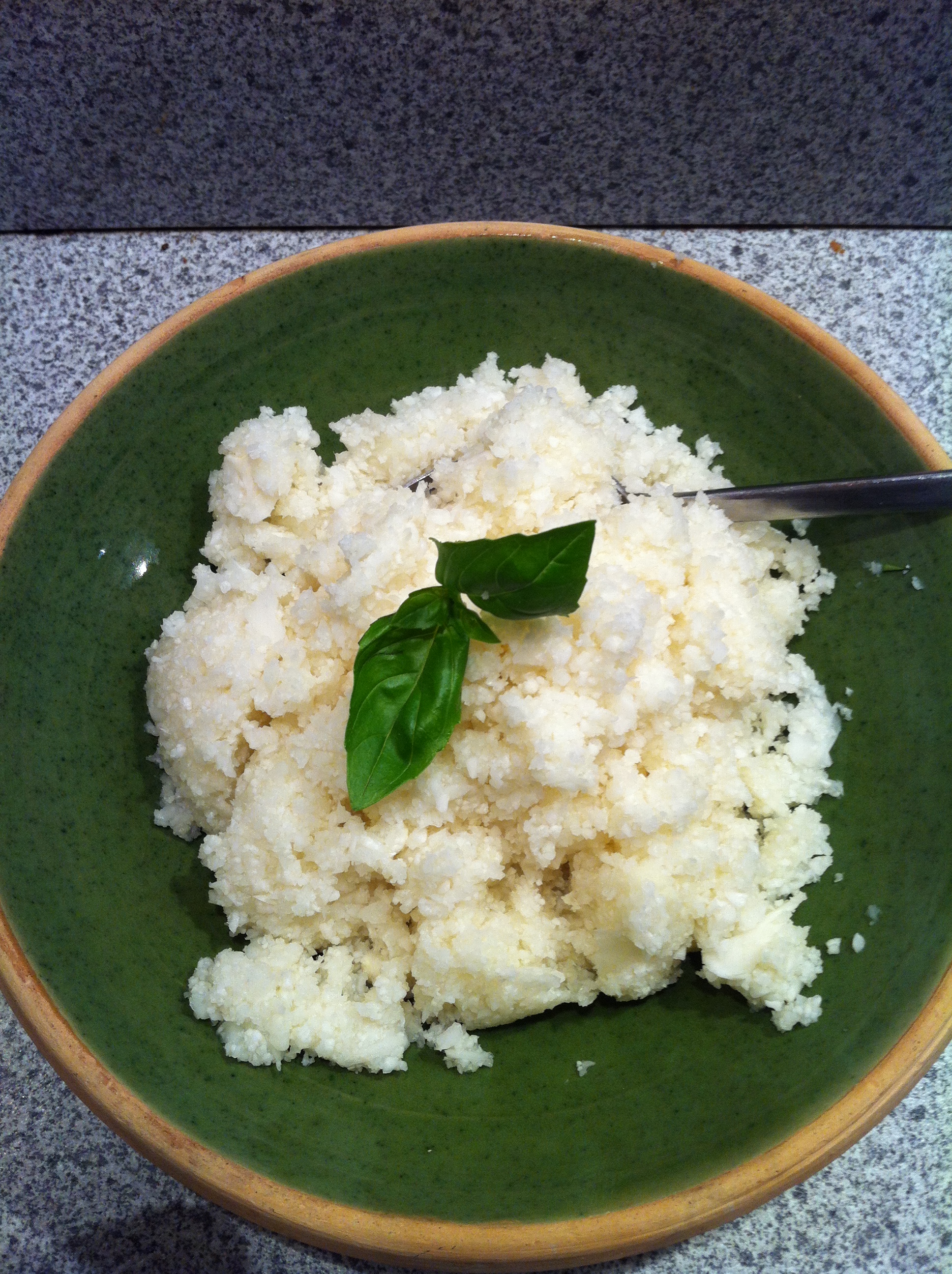 Løg og hvidløg svitses i olien til de er klare og lysebrune. Det revne blomkål tilsættes og svitses med i nogle minutter. Frisk, hakket baslikum, chili og salt tilsættes. Serveres evt. drysset med lidt revet parmasan ost.