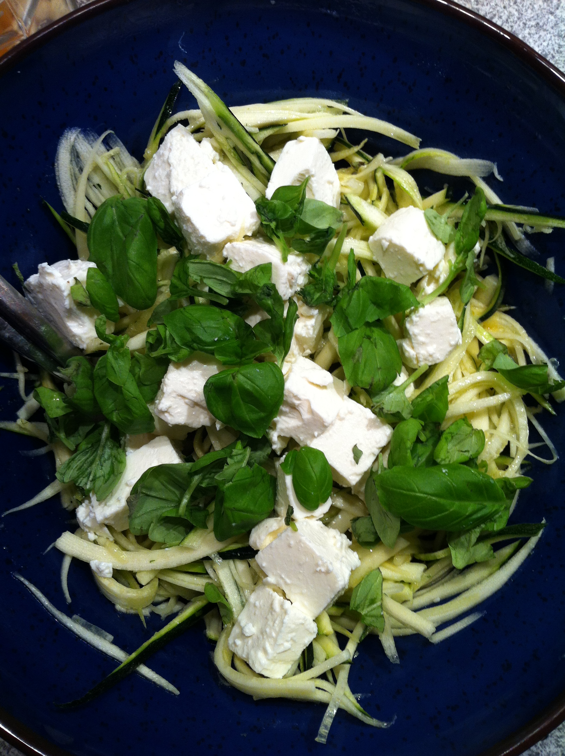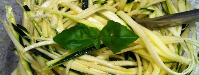 Man tager ganske enkelt en skyllet squash og sit mandolinjern. Squashen skæres i strimler – som spaghetti. Man kan nøjes med at dryppe olivenolie på og lidt salt. Jeg plejer nu at komme en smule af min gode basis dressing over. Smager også herligt drysset med mager fetaost og basilikum. Velbekomme.