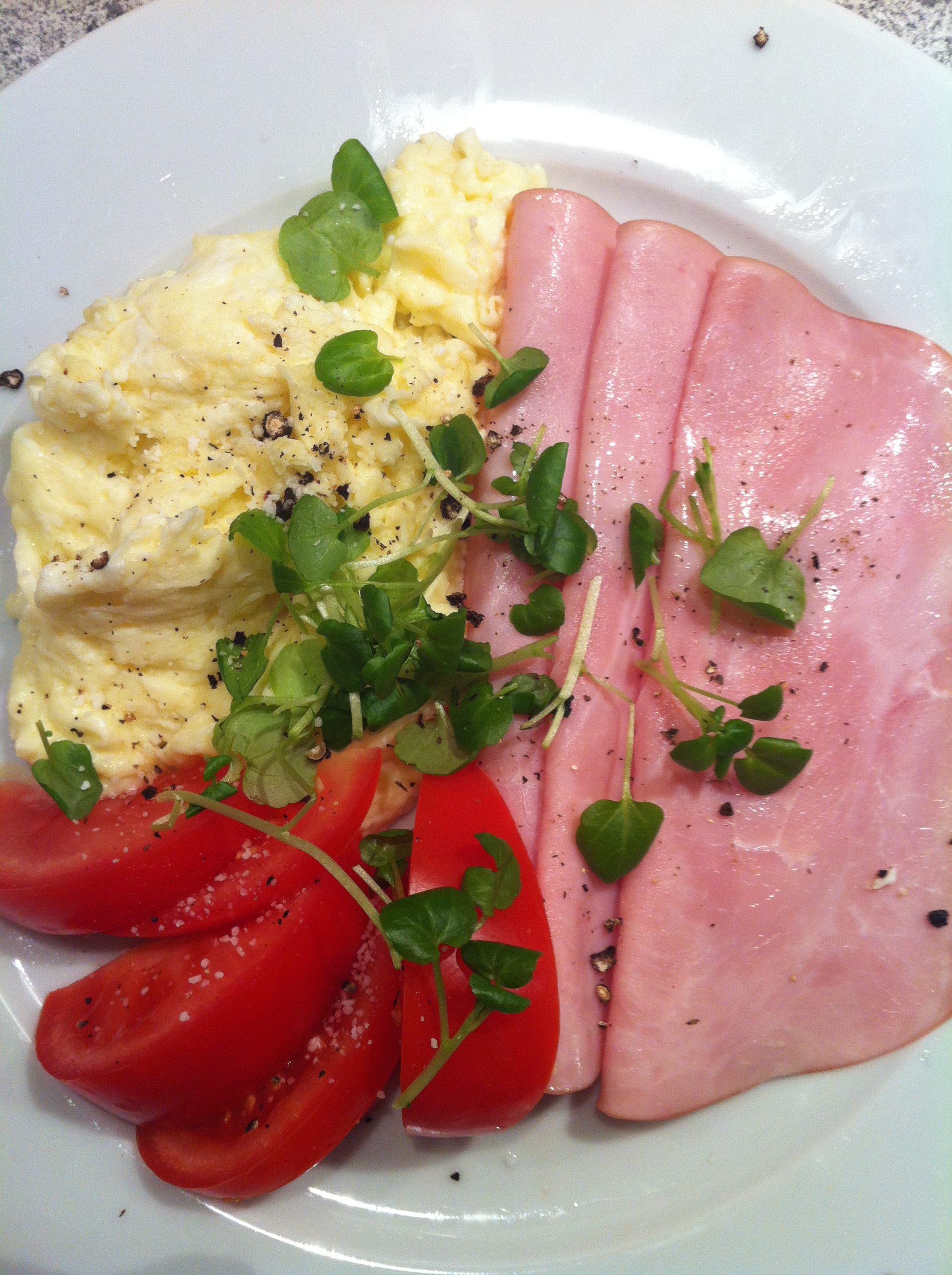 Æggene røres let med 1 sp vand og hældes på en pande med 1 ts olivenolie. De svitses under omrøring, indtil der ikke er mere flydende æggemasse (ca 2 min). Serveres med skinke, tomat og UDEN brød, hvis man vil spare på kulhydraterne .