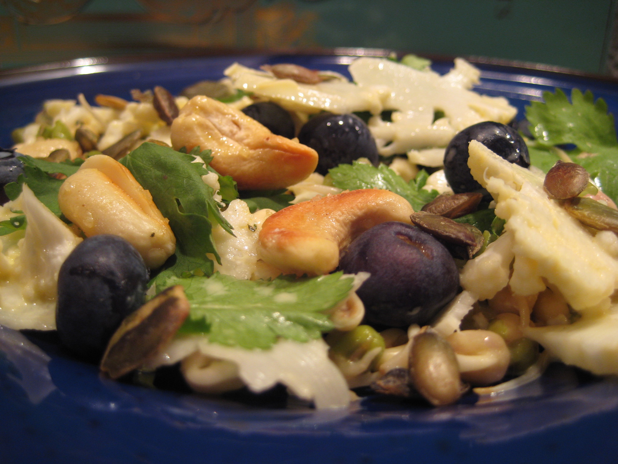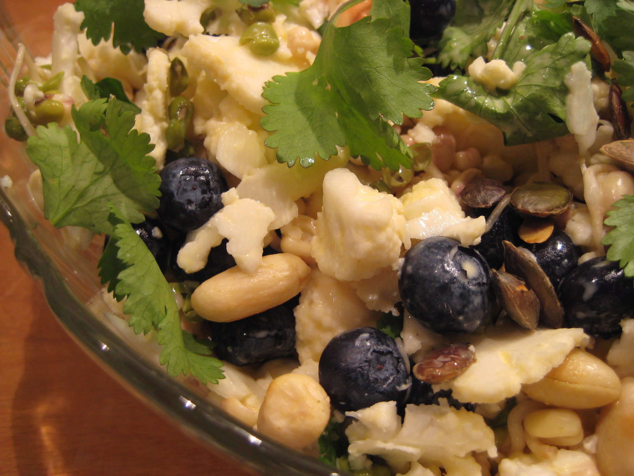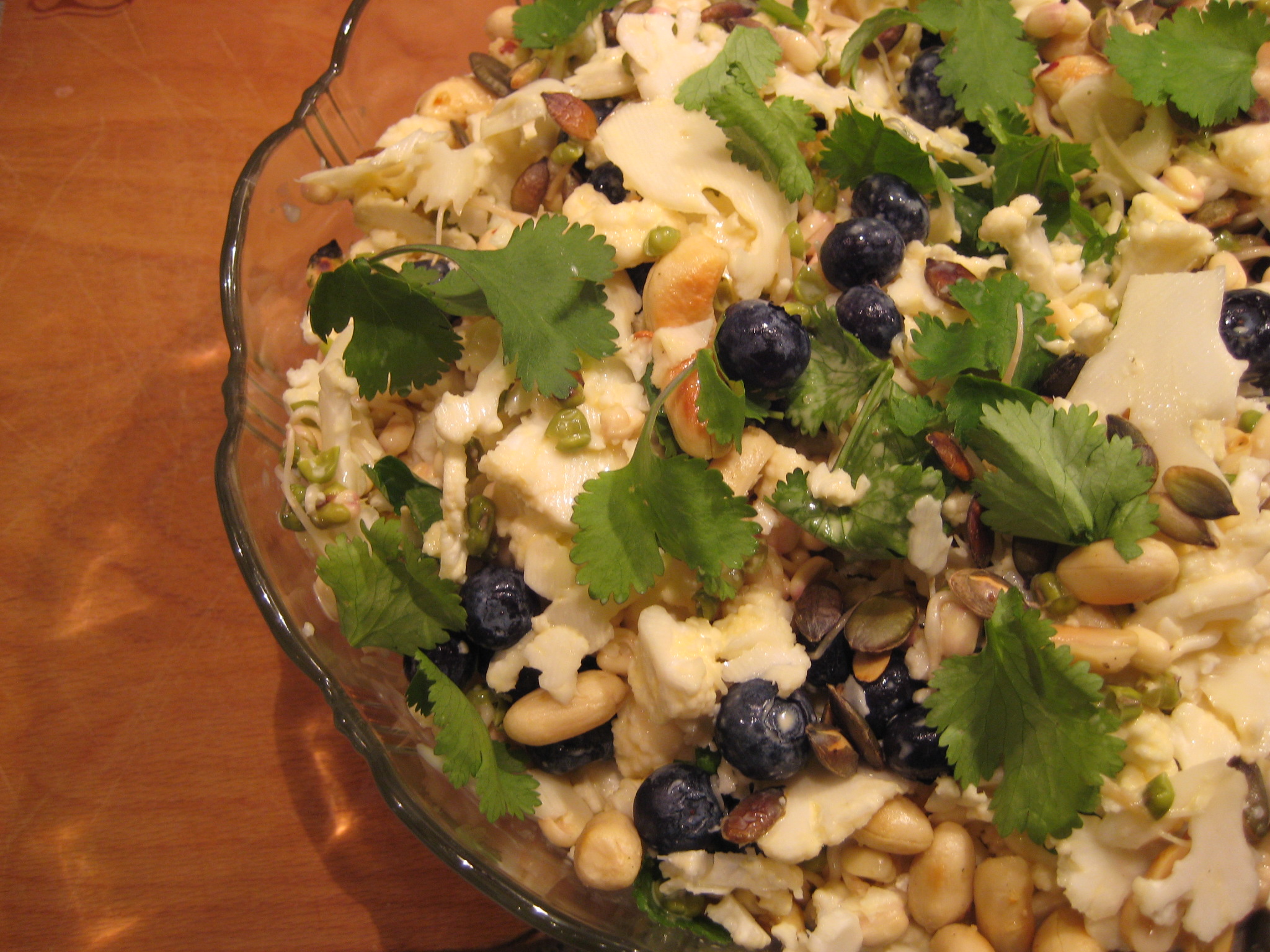 Pisk dressingen sammen med en elpisker eller en stavblender. Bruger man en stavblender, kan det hele blandes på en gang. Bruges en elpisker, skal olien piskes langsomt i til sidst (ellers skiller dressingen). På den rå blomkål fjernes blade og stok (del den først i kvarte, så går det nemt). Kålen skæres i meget tynde skiver (f.eks. med et mandolinjern, hvilket giver et rigtig flot resultat). Cashewnødderne ristes og saltes (hvis ikke de er det i forvejen). Det hele blandes i dressingen sammen med blåbær og koriander. Må gerne trække i ca 1 time, inden servering (så bliver blomkålen lidt blødere).
