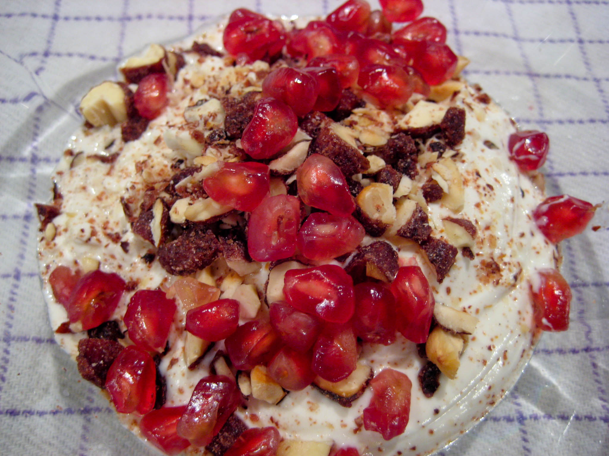 Hytteosten røres med vanilie og sød. Nøddecrunchen hakkes og drysses sammen med granatæblekernerne over retten.
