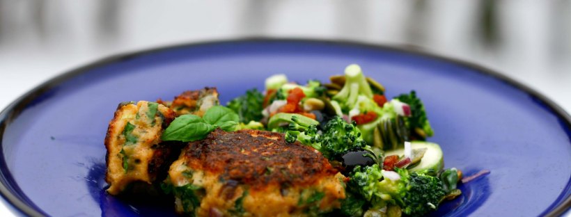 På denne meget kolde og lidt kedelige tirsdag skulle der handles i Netto efter arbejde. Det var egentlig min tanke at lave en LCHF udgave af Croque Madame (mere om det en anden gang), men jeg blev fristet af tilbud på broccoli til en femmer samt et par pakker lakse fars med “røde mærker” (sat ned til ½ pris pga udløbsdato imorgen). Hjemkommet med disse gode køb og suppleret med lidt godt fra grøntsags skuffen blev det til en lækker og sund – og hurtig lavet hverdags ret bestående af lakse frikadeller rørt op med lidt ekstra grønt samt en broccolisalat, der var en smule anderledes, end den plejer. Alle var yderst tilfredse og vores kære mand/ far fik sig et stykke rugbrød til og et par striber remoulade – så han var også glad.