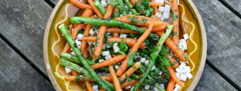 Skyl asparges og knæk det nederste, seje stykke af. Skyl gulerødder og fjern toppene. Vask kinaradisen og skræl den. Pil og hak løget i fine tern eller skær det i tynde skiver. Vend asparges med olie og salt og grill dem på grill eller grill pande i ca 2 min ved højeste varme. Blancher gulerødderne i 1 min. Vend kinaradisen, skåret i fine tern med citronsaften og bag dem evt i ovn ved 150 gr i 10 minutter (kan sagtens udelades).