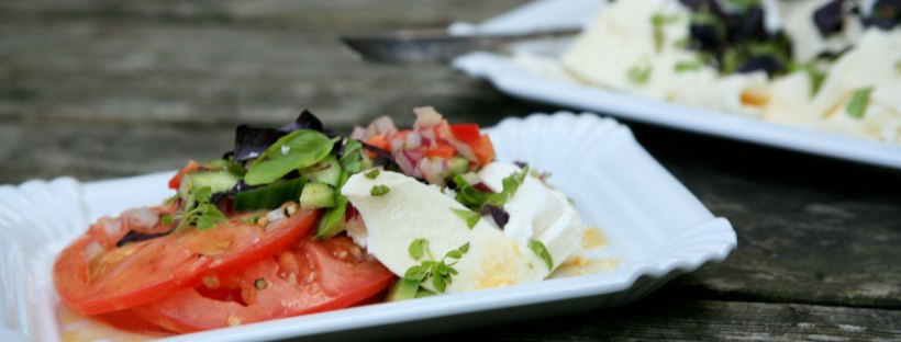 - Feta skæres i tern, mozzarellaen i skiver og det hele anrettes på et fad og drysses med den hakkede basilikum.