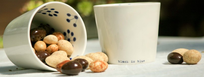 Efter en uge med studenter festivitas (som heldigvis ikke er slut endnu) og endnu en nybagt studine – nemlig Katrine, der igår også fik sin studenterhue – er jeg kommet totalt i gavehumør. Heldigvis har vi et par af Anne Black´smukke krus liggende, som vi har fået lov til at forære til en af jer skønne læsere. Vi er meget begejstrede for serien “Black is blue”, som har regelmæssige former med et klassisk blåt mønster. Porcelænet er malet på indersiden for at vise, at skønhed kommer indefra – og det er jo så sandt, som det er sagt:-). Krusene kan bruges til at drikke af, til små desserter, til at servere salte eller søde snacks i – eller …….På billederne her har vi brugt kopperne til en god latte og til vores yndlings mandler fra nøddemanden i Bazar Fyn: mandler med mørk chokolade med havsalt, med tiramisu chokolade og med hvid chokolade med kardemomme. Mums 🙂
