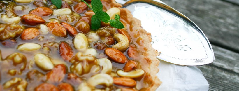 4 thoughts on “Nøddekarameltærte med mazarinbund