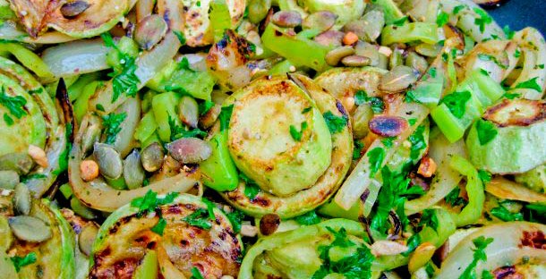 - Squashene vendes i og retten drysses med ristede græskarkerner og friske krydderurter efter eget valg.