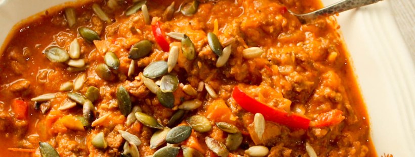 Det er årstid for græskar og simremad. Dagens ret er særdeles godt krydret og jævnes fint af græskar stykkerne – og du kan sagtens bruge kødet fra dine udhulede halloween græskar. Det er en ganske glimrende, økonomisk og velsmagende hverdagsret, der passer godt til en gang squash spaghetti eller blomkålsris (eller der mere stivelsesholdige versioner, om man vil).  Halloween gryde med græskar og chili