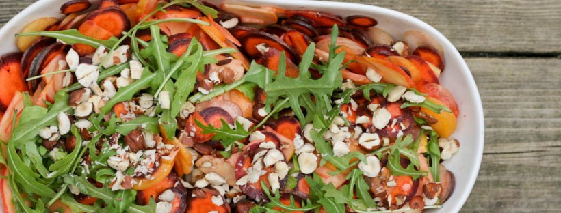 Gulerødder og æbler er ikke low carb, men de er stadig sunde. Hvis man spiser striks LCHF, bør man dog springe denne opskrift over – eller nøjes med en meget lille portion. Da sønnike vender hjem fra Århus for et par dage, skulle han da have en af barndommens livretter til sin moussaka – nemlig råkost. Min nye fine Magimix 5200 på køkkenbordet skal jo ikke stå og samle støv, så jeg ville prøve at skive gulerødderne og æblerne i stedet for at rive dem. Det gik lydløst og lynhurtigt og blev ganske fint – og giver samtidig lidt mere at tygge på. De vilde gulerødder, som er lilla udenpå fås bl.a. i Kvickly i en pose med økologiske gulerødder i forskellige farver (vilde, hvide, gule og orange). Smagen er som i almindelige gulerødder, men de er virkelig festlige at se på. Og vi spiser jo også med øjnene, ikke sandt?