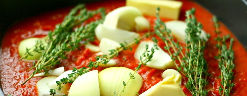 1. Tomater, smør, pillede løg i kvarte, rosmarinkvist og hvidløg koges i en gryde med låg i 1 – 1½ time. Det skal IKKE svitses først. Den lange kogetid gør, at smørsmagen trænger igennem og giver saucen en fantastisk smag.