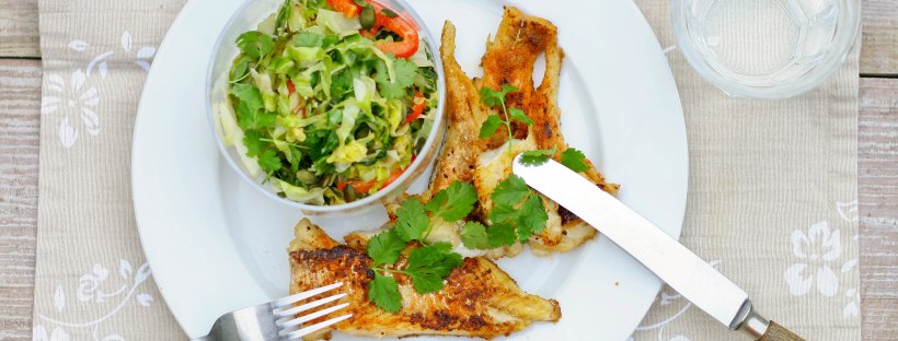 • Server for eksempel til en torskefilet, som er krydret med barbecuesalt og stegt i kokosolie i et par minutter på hver side.