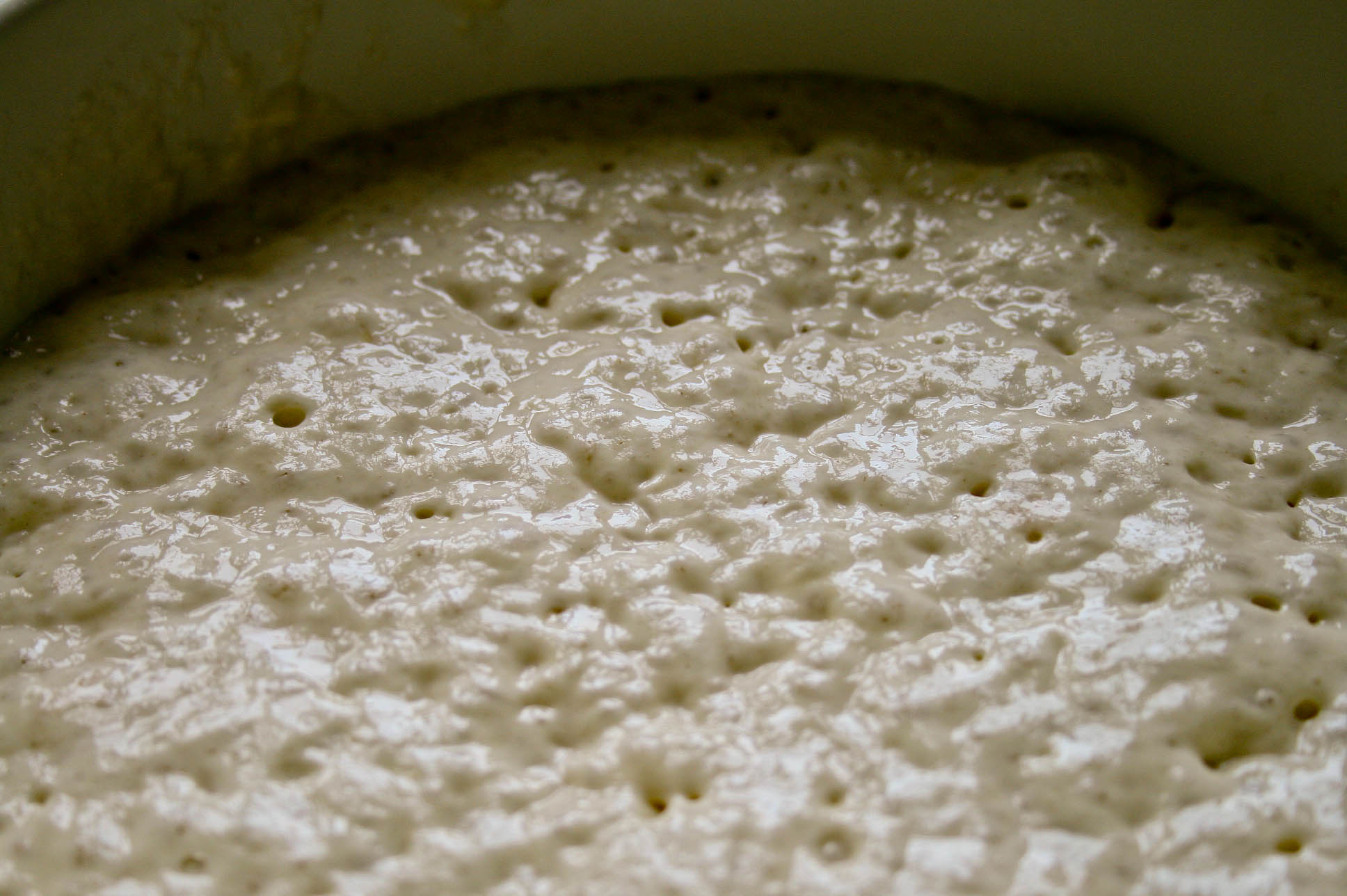 - Rør salt og hved3mel i. Det skal ikke æltes, bare sørg for at melet er rørt ud i vandet. Dejen skal være våd, men ikke flydende.