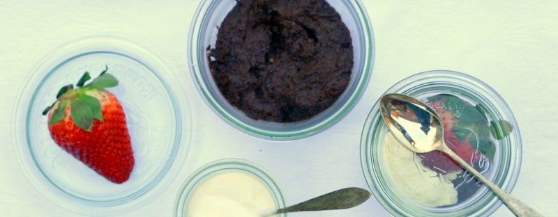 Når det er sagt, så er det en kage, som er bagt på 1 minut – og derfor er den ikke helt så saftig som en ovnkage (vær opmærksom på, at du ikke bager den for meget – så bliver den nemlig meget tør). Jeg serverede den med 1 spiseskefuld creme fraiche 38% (du kan også bruge flødeskum) og et jordbær. Velbekomme.