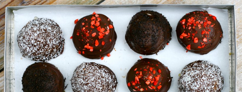 • Når chokoladen er størknet, kan du pensle bunden med chokolade, så alt er dækket. Det øger holdbarheden på flødebollerne