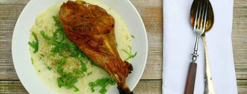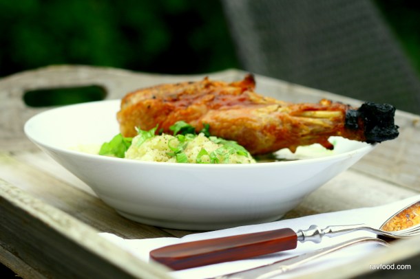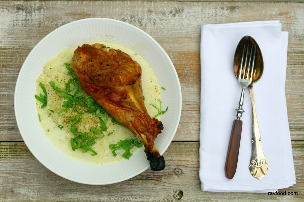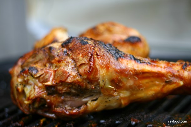Jeg valgte at koge kalkunlårene i ca 1½ l vand med 1 grøntsagsbouillonterning i ca ½ time. Herefter slukkede jeg for varmen og lod dem blive i gryden. Slutteligt blev de krydret med salt og fik ca 45 minutter ved inddirekte grillning (ca 200 °).