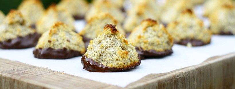 13. Dyp bunden af kokosmakronerne i chokoladen, sæt på et rent stykke bagepapir og lad chokoladen størkne.