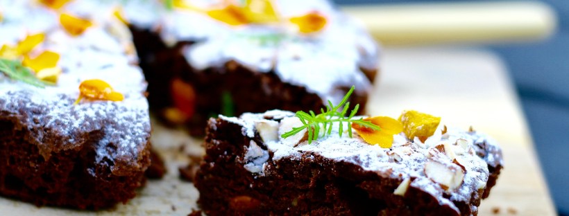 14. Afkøles (gerne til næste dag), drysses med Sukrin melis og pyntes f.eks. med frysetørret havtorn samt blomster og blade fra appelsintagetes