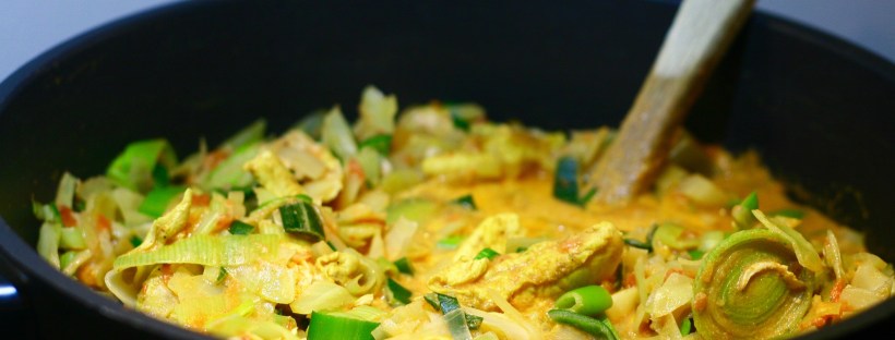 Dagens ret er en virkelig nem og lækker hverdagsgryde. Du kan bruge hakket oksekød i stedet for kylling og du kan erstatte porrerne med gulerødder. Retten smager ikke særlig meget af karry – men blandingen af tomat og karry giver en dejlig mild smag. Jeg tror faktisk, at de fleste vil kunne lide den – også mændene og børnene. Min egen mand har sagt god for den – og som I ved, så er han lidt grøntsagsforskrækket.