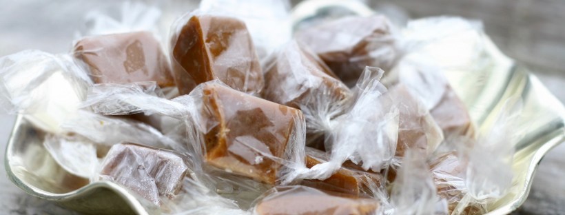 Jeg har valgt at koge karamellerne rigtig længe, så de bliver rimelig hårde. Efter kort tid i munden er karamellen blød som smør og du får den herligste smagsoplevelse. Pak dem ind i cellofan og de vil pynte smukt på konfektfadet.