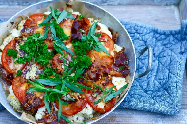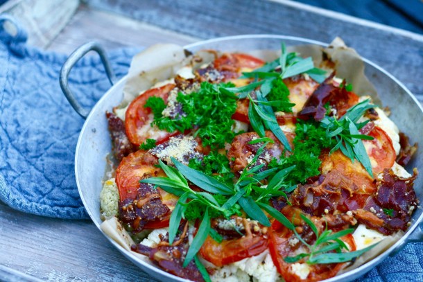 Aftensmaden blev derfor, hvad der lige var i køleskabet. Blomkål og bøftomater i grove skiver, hytteost med løgpulver og chili som smagsgiver, en smule lufttørret skinke og lidt revet cheddar og parmesan ovenpå. Hele herligheden passede sig selv i ovnen, mens jeg tog et bad efter den hårde træning.