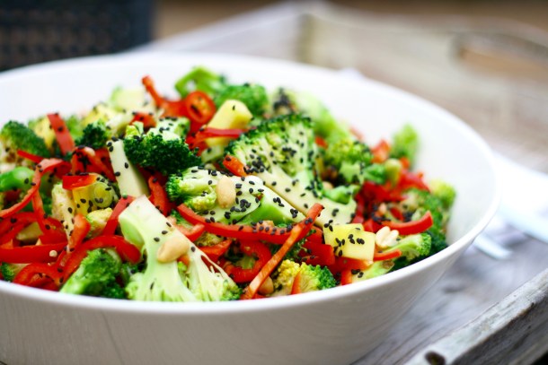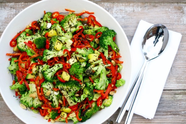 Salaten passer super fint til såvel kylling som fisk. Du kan erstatte peanuts med andre nødder – f.eks. ristede cashewnødder som i originalopskriften. Jeg har valgt at supplere med snackpeber, så der er lidt mere sprødt at tygge på. Broccolien er der også bid i, selvom den er blancheret.