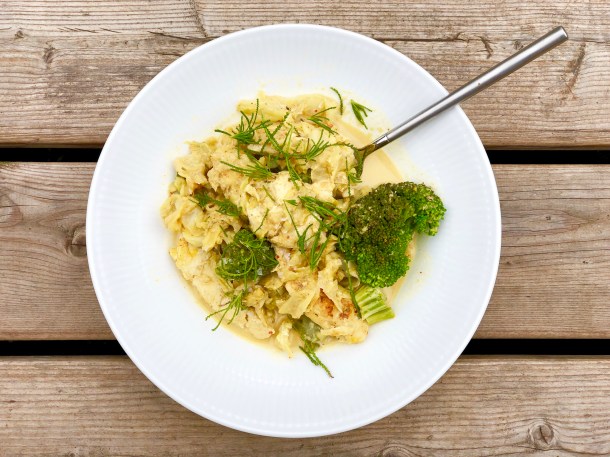 Kylling i karryfløde med spidskål og broccoli