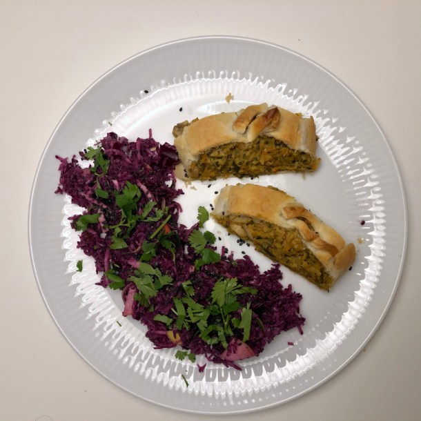 Vi spiste stegen sammen med en frisk rødkålssalat med squash, æbler, tørrede abrikoser, ristede sesamfrø og frisk koriander.