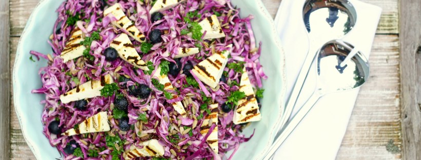 Denne salat er smuk og sprød og rød. Den er meget enkel - og du kan udskifte den røde spidskål med almindeligt spidskål eller hvidkål. Grillosten kan erstattes af feta og kernerne af hassel- eller valnødder. I stedet for blåbær kan du bruge tynde skiver af danske sommeræbler eller - pærer. Og således kan en salat … Fortsæt læsning Rød spidskål med grillet halloumi