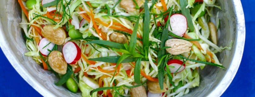 Dejlig smuk og sprød sommerslaw med et asiatisk twist fra den friske estragon. Salaten passer perfekt til sommerens grillkylling eller fisk. Vi spiste den til grillet kyllingfilét, som jeg havde krydret med Fivespice blandingen fra Mill & Mortar. Sommerslaw´en har et ganske fornuftigt næringsindhold. Den er lav i kulhydrat og 1 portion giver dig 15 - … Fortsæt læsning Sommerslaw med spidskål, gulerod, radise, forårsløg og edamamebønner