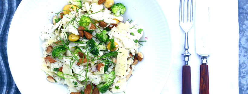 Dagens salat er lynhurtig at lave og fungerer fint som en erstatning for kartoffelsalat. Jeg lavede den til min frokost på arbejde, hvor jeg spiste den sammen med en skål rejer. Salaten smagte skønt og vil også fungere fint til frikadeller eller til sommerens grillretter. Der er ikke særlig meget dressing til salaten, fordi jeg … Fortsæt læsning Blomkålssalat med asparges og pestomayo