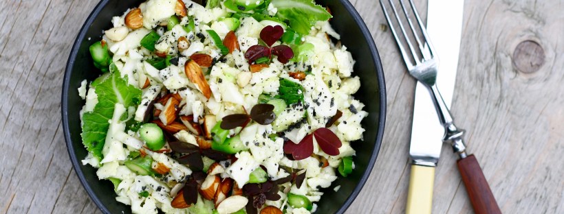 Blomkålssalat med grønne asparges, forårsløg, skovsyre og ristede mandler