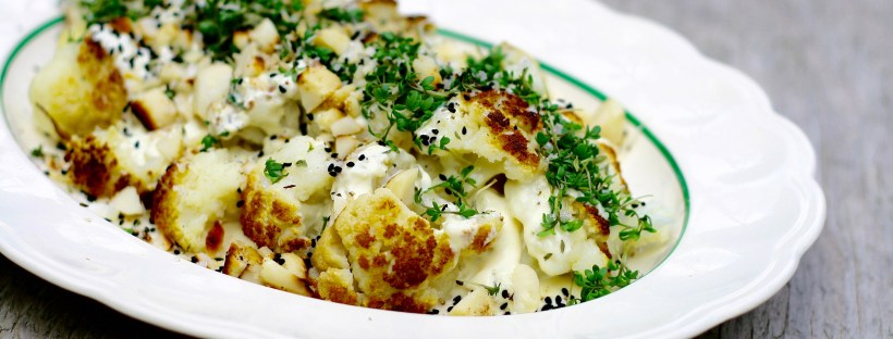 Jeg har nævnt det før - men blomkål er altså en fantastisk opfindelse. Du kan spise det rå, kogt, grillet eller som i denne opskrift bagt. Du kan hakke det til salater, rive det til indiske blomkålsris, mose det med bacon og andet godt- eller ganske enkelt komme det hele blomkål i ovnen. I love it 🙂 Idag … Fortsæt læsning Bagt blomkål med nødder, karse og sennepscreme