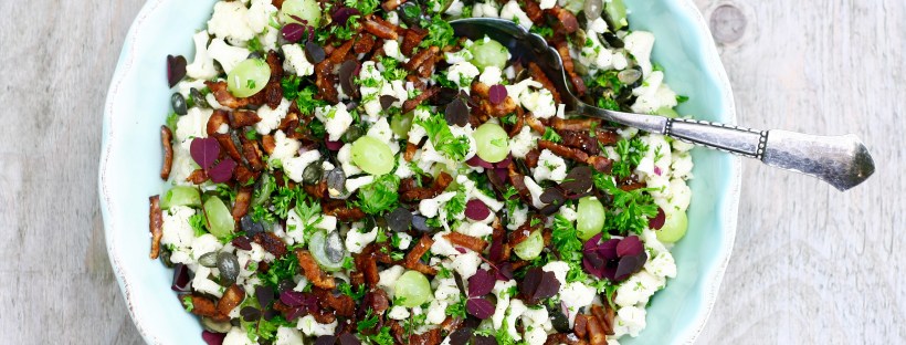 Som den store blomkålselsker jeg er, har jeg længe haft lyst til at prøve en blomkålsversion af vores alle sammens elskede broccolisalat. Og den blev altså rigtig god. Ingredienserne er - altså bortset fra at broccoli er udskiftet med blomkål - stort set de samme som i broccolisalaten. Jeg har dog smidt en masse frisk persille … Fortsæt læsning Blomkålssalat med bacon, kerner og druer
