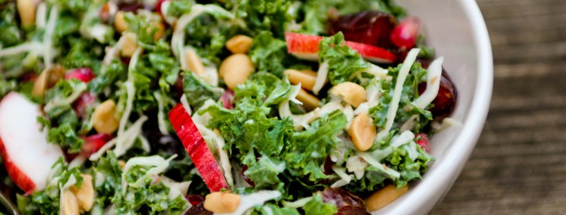 Grønkålscoleslaw med granatæblekerner, dadler og peanuts