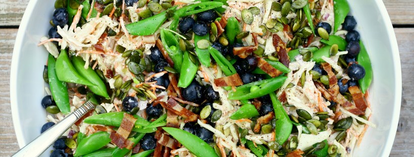 Salaten her spiser vi idag som tilbehør til aftenens grillede cuvette og kyllingelår. Den er lavet udfra nogle grøntsager, som jeg havde liggende i køleskabet. Jeg havde købt 2 pakker klargjort coleslaw (dvs revet hvidkål og gulerødder) til ½ pris pga kort holdbarhed. Dressingen var fuld af kulhydrater og smagte skrækkeligt, så den røg ud. Med … Fortsæt læsning Hvidkålssalat med sugarsnaps, blåbær og bacon