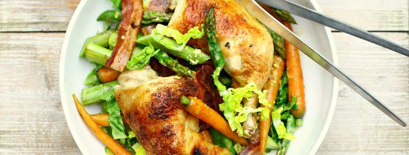 Dagens ret er en hurtig og nem ovnret - som også kan laves på grill, hvis verjguderne skulle forbarme sig over os på et tidspunkt. Idag blev det altså ovnen - og manden og jeg nød hver vores kyllingeoverlår fra Allégårdens Kylling. Lårene vejer ca 400 g pr stk, de er meget saftige og de smager … Fortsæt læsning Grillet kylling med bacon, asparges og gulerødder